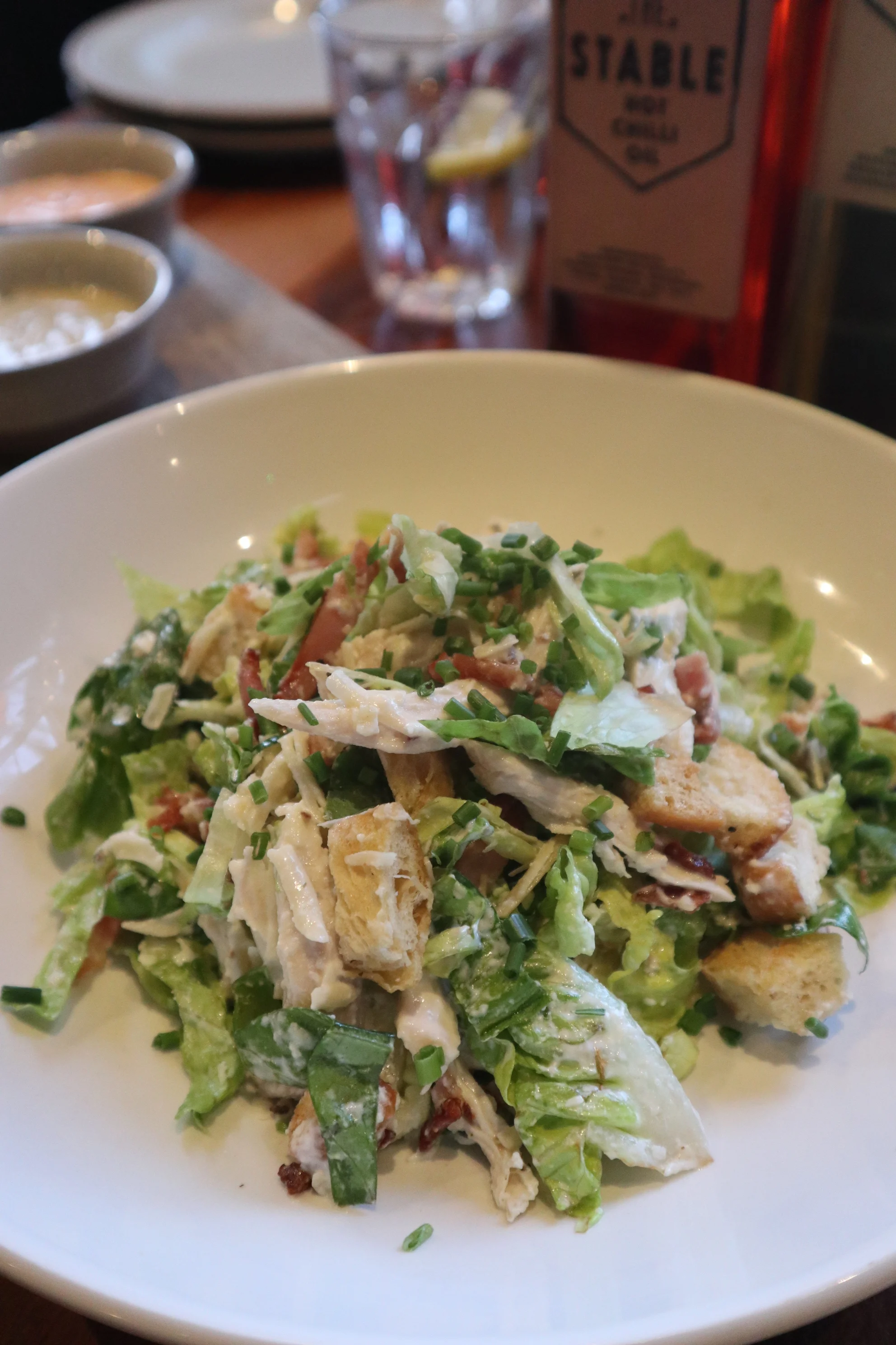 Caesar Salad - torn chicken breast and smoked bacon tossed with baby gem lettuce, garlic, croutons