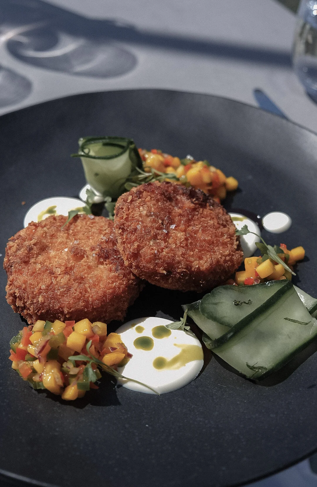 For starters, we tucked into charcuterie and chickpea spice rolls - I cannot explain how explosive the flavours were. For our main dish, we opted for the Thai salmon cakes - again, they were utterly delicious! Considering this was my first meal out of the house (re lockdown) it felt like a huge treat! Sunshine, outstanding food, and a world-class view - what more could you want?